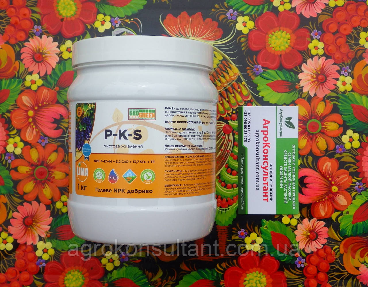 P-K-S, NPK 7-47-44 + 3,2 CaO + 13,7 SO₃ + TE - гелеве добриво з високим вмістом фосфору, калію, кальцію та сірки. Спеціально розроблене як "стартер" та "фінішер", для використання в період укорінення рослини, після проростання або пересадки, навесні для плодових дерев, перед цвітінням або в кінці циклу вирощування.